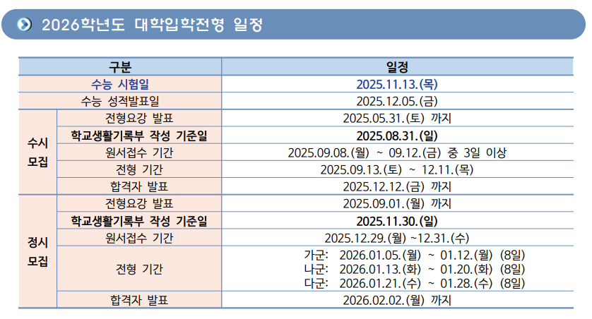 * 각 대학별 정확한 일정은 해당 대학의 모집요강을 반드시 확인하기 바랍니다.
