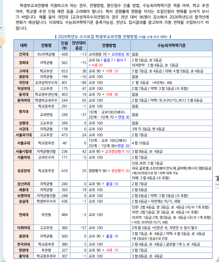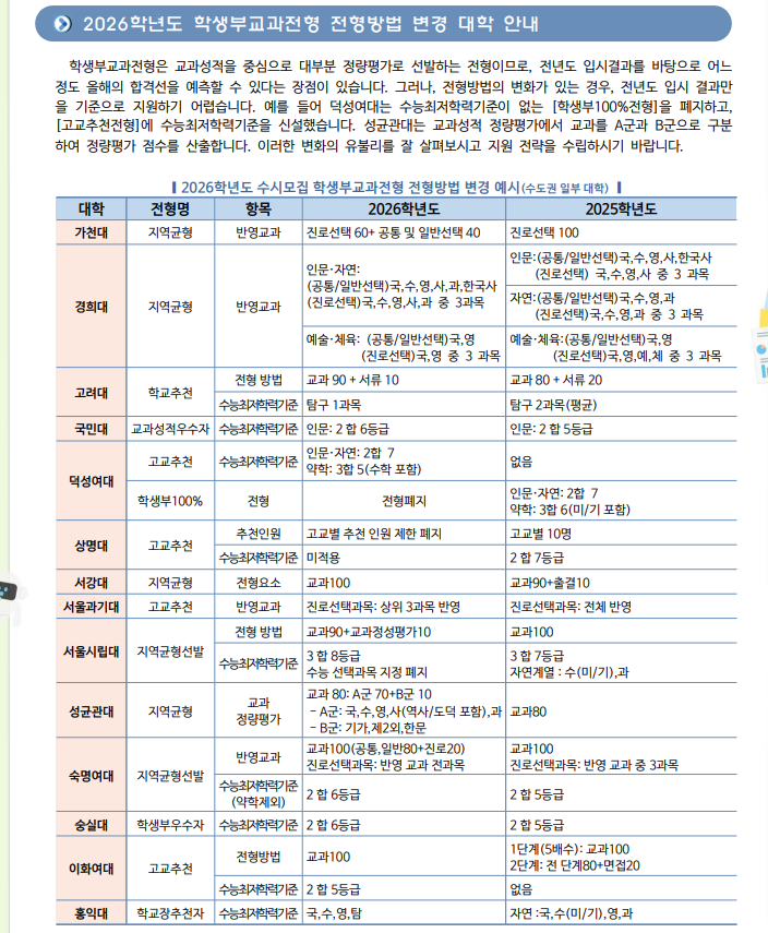 2026학년도부터 학생부교과전형에 약간의 변화가 예정되어 있습니다. 아래는 주요 변경 사항입니다.